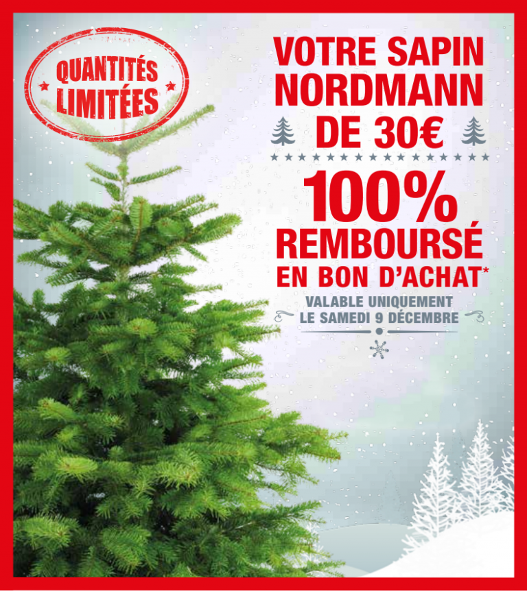 Samedi 9/12, rendez-vous dans votre magasin Brico et recevez un Sapin Nordmann d’une valeur de 30€ gratuitement. Celui-ci vous sera en effet remboursé sou…